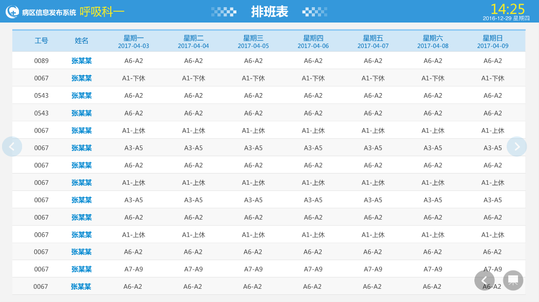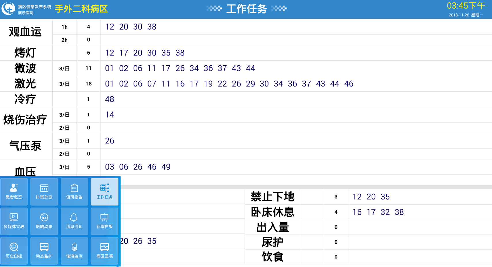 護理交互大屏通過對臨床護理信息和醫(yī)療物聯(lián)設(shè)備信息的抓取、整合、分析、重組,實現(xiàn)信息可視化顯示并搭建人機交互的平臺。該平臺不僅能從傳統(tǒng)的HIS工作站和移動護士工作站中抓取臨床護理信息,還可以將臨床護理信息進行解析、分類、結(jié)構(gòu)化顯示。交互大屏集成了臨床護理中頻繁使用的信息模塊,如患者電子概覽板、排班總覽、值班報告、工作任務(wù)、健康宣教等功能。
