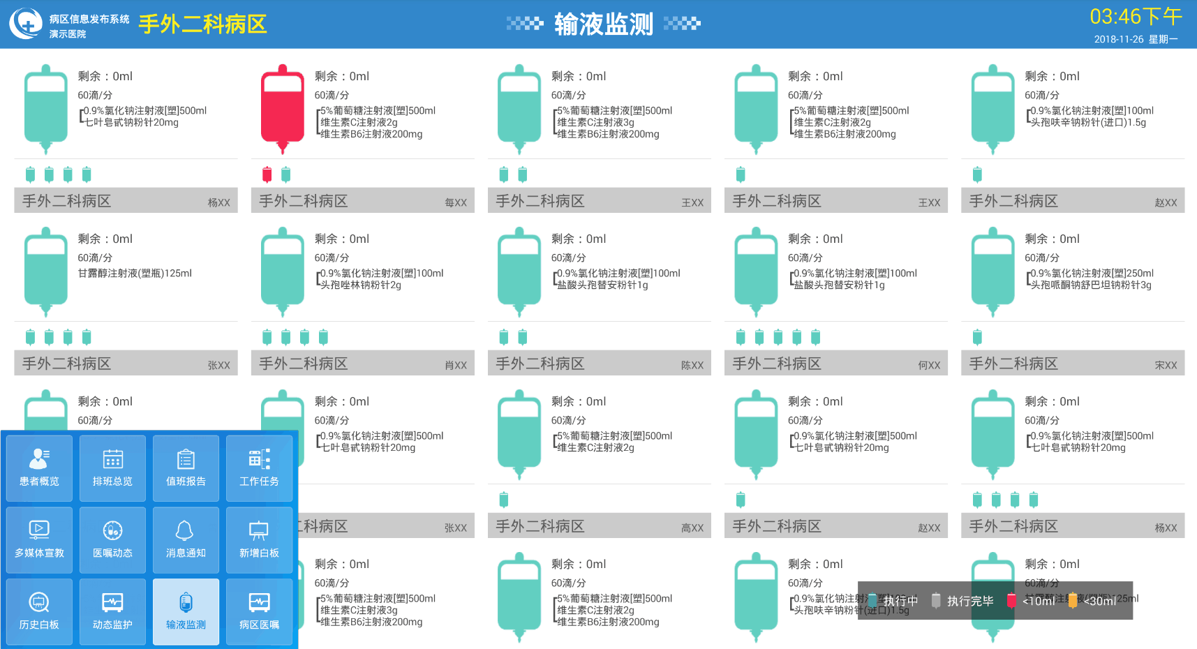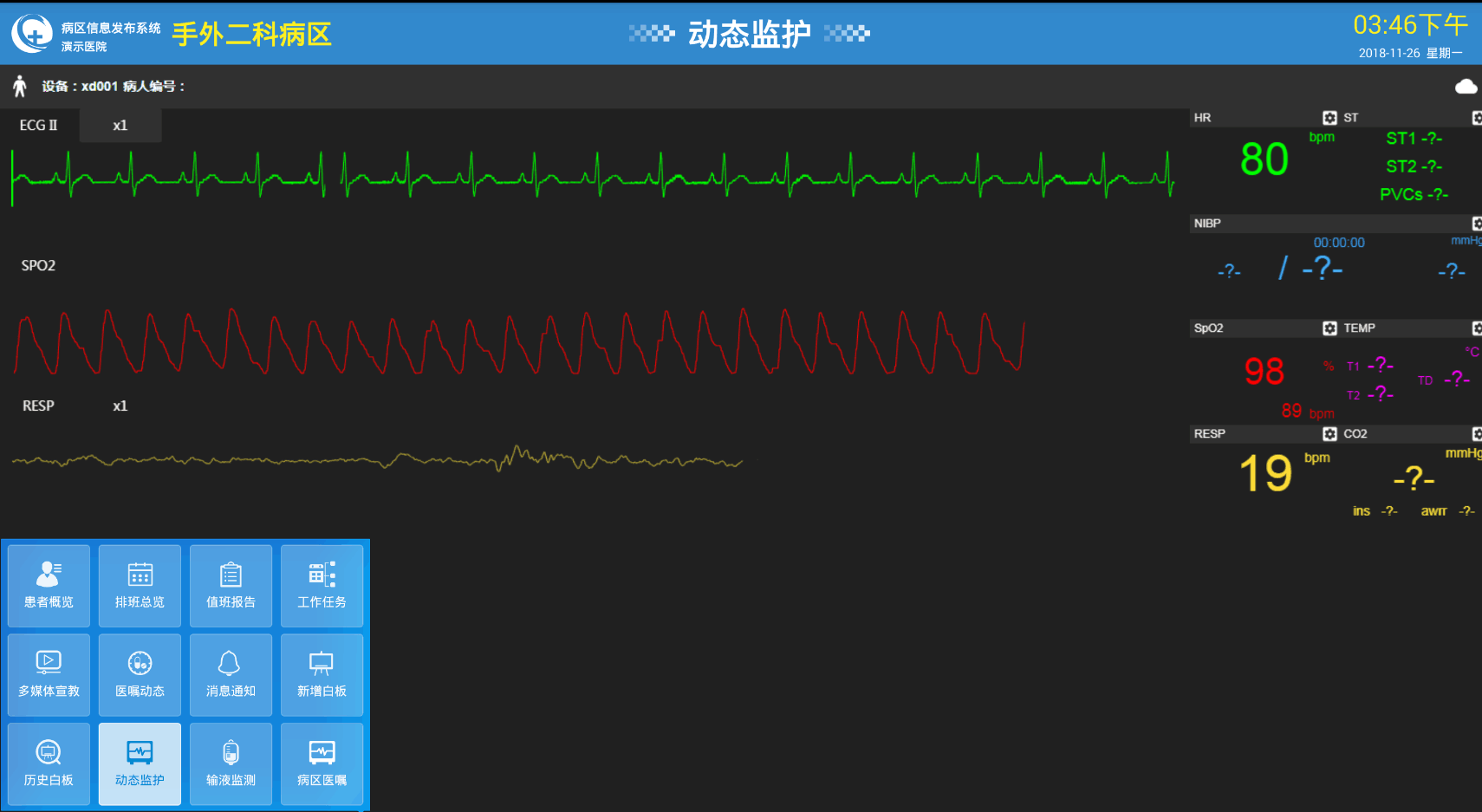 通過對接院內(nèi)物聯(lián)網(wǎng)設(shè)備動態(tài)顯示監(jiān)護數(shù)據(jù),如心電監(jiān)護儀、輸液泵、輸液秤等。