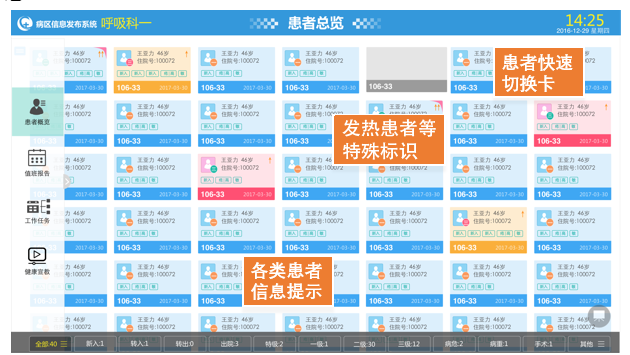 通過矩陣標簽式患者視圖,概覽整個病區(qū)情況,并可以快速點選、交互查看不同類型患者信息,通過圖形化方式展現(xiàn)患者類型、出入院情況、基本信息、發(fā)燒情況、護理級別、病情危重程度等。