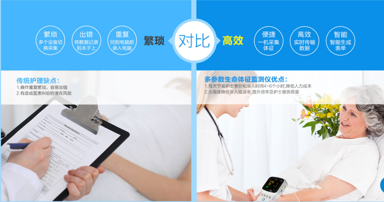 護(hù)士可通過一個(gè)設(shè)備采集多項(xiàng)患者體征,如體溫、血壓、血糖、脈搏、血氧等,并將數(shù)據(jù)傳送回服務(wù)器從而同步到患者相應(yīng)的移動(dòng)護(hù)理、電子病歷等患者在院診療系統(tǒng)上。