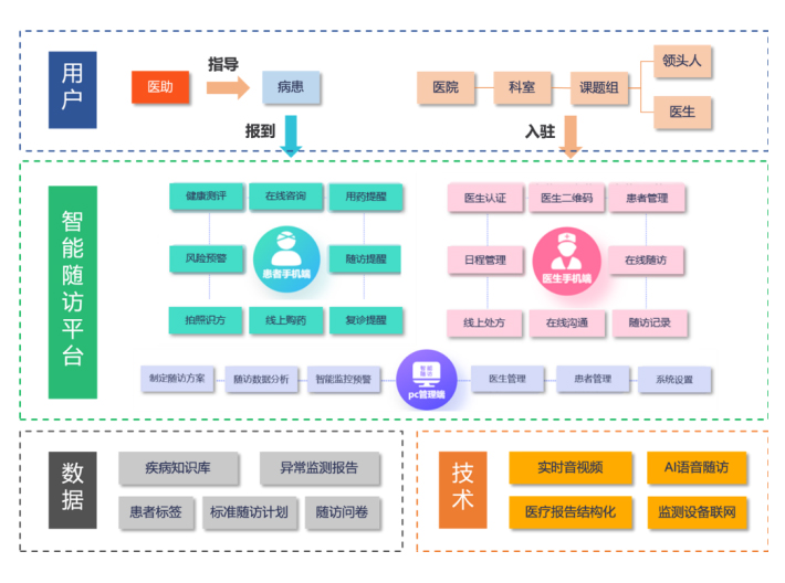 天坦智能開發(fā)的慢病管理運營服務是一套完整的心血管隨訪標準體系,配合適用性極強的醫(yī)生端可配置界面,滿足絕大多數(shù)開展冠心病介入的醫(yī)療機構需求,同時,基于專家隨訪團隊之間的協(xié)作,建立上下聯(lián)動的醫(yī)生互動機制,為隨訪的患者提供專業(yè)的管理方案。匹配有人工智能為核心的隨訪管理機制,可自動化發(fā)送患者所需要信息,量表等隨訪內容,具備機器學習功能,針對不同醫(yī)院形成不同模式的隨訪系統(tǒng)配置,匹配個性化的醫(yī)院隨訪體系,最終以患者交流平臺,建立以患者需求為中心的線上服務體系,包括專家線上咨詢、藥品直送、可穿戴式設備居家監(jiān)護、護理居家康復及圍繞手術全周期的保險支付產品。形成以醫(yī)學+智能+個性化+支付功能為一體的新一代的慢病管理平臺。