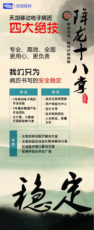 天坦軟件,作為國內(nèi)移動電子病歷的先行者,盛裝亮相京交會。在會上展示了以“天坦移動電子病歷”為核心的醫(yī)院整體信息化系統(tǒng),受到眾多參觀者的關(guān)注。天坦軟件始終堅(jiān)持以“讓天下沒有難看的病”為宗旨,致力于醫(yī)療事業(yè)發(fā)展。為中國醫(yī)療衛(wèi)生行業(yè)的信息化建設(shè)以及個人健康服務(wù)提供從硬件到軟件、從技術(shù)到服務(wù)的全面解決方案,是中國醫(yī)療信息化市場中快速成長的獨(dú)立軟件廠商之一。數(shù)年來,一直堅(jiān)持研發(fā)以移動電子病歷為核心的醫(yī)院信息化系統(tǒng),從移動框架的病歷編輯器到跨平臺的移動醫(yī)療解決方案,為整個病歷信息化行業(yè)注入了極強(qiáng)的創(chuàng)新活力。 “天坦移動電子病歷”為核心的醫(yī)院整體信息化系統(tǒng)秉承“高效應(yīng)用、信息互通”的基本理念,是專門為醫(yī)院設(shè)計(jì)開發(fā)的醫(yī)療信息化系統(tǒng)的核心組成部分。具有高效、安全、穩(wěn)定、易用、移動、智能等特點(diǎn),除此之外,還具有穩(wěn)定、完全跨平臺運(yùn)行、功能強(qiáng)大、系統(tǒng)性能卓越等巨大優(yōu)勢。