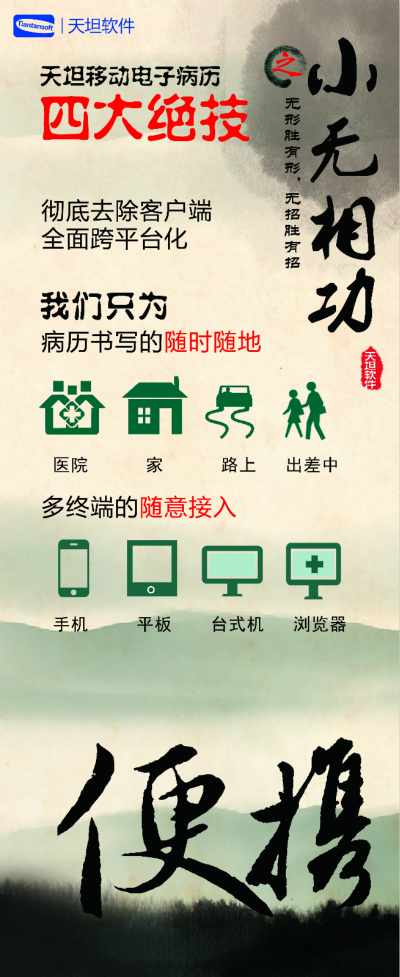 在全球范圍,向移動互聯(lián)網(wǎng)推進(jìn)的浪潮已經(jīng)勢不可擋, 醫(yī)療行業(yè)如其他行業(yè)一樣,要想更好地發(fā)展,必須融入這個浪潮。天坦軟件通過多年的努力,打造出“天坦移動電子病歷”,加強(qiáng)了醫(yī)院管理效率和力度,避免醫(yī)療差錯和事故,改善醫(yī)患關(guān)系,減少醫(yī)患矛盾,提高醫(yī)護(hù)人員的工作效率,提高醫(yī)療服務(wù)響應(yīng)能力,隨時(shí)隨地為患者服務(wù)。