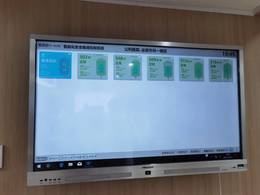 確定了用哪種輸液監(jiān)控技術(shù),變成“智慧輸液”卻還需要一個信息化工程,這就是信息護(hù)士產(chǎn)生的原因。以智慧輸液為例,要讓輸液信息“跑”起來,就要一張“網(wǎng)”——具象地看就是智慧病房的7個屏:病床有兩個屏,大屏功能很多,不但可以看視頻、叫護(hù)士……還可以完成出院結(jié)算;小屏就是以前床頭的“小白卡”,顯示患者姓名、護(hù)理級別等。護(hù)士站有三個屏,一個大屏是輸液控制屏,顯示全病區(qū)的輸液情況;另外一個大屏相當(dāng)于寫字板,就是護(hù)士站常見的手寫黑板的“升級版”,除了即時更新醫(yī)囑外,還可以在病房看到正在做的手術(shù)情況等;此外還有護(hù)士站管理屏。再加上走廊屏、房間屏,所有的信息一次輸入、全程“跑動”。